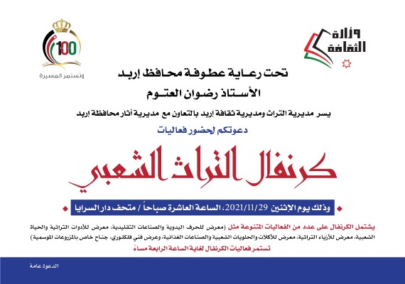 برعاية محافظ إربد رضوان العتوم، ينطلق في العاشرة من صباح يوم الاثنين 29/11/2021 في متحف دار السرايا في إربد "كرنفال التراث الشعبي" الذي تنظمه مديرية التراث ومديرية ثقافة إربد بالتعاون مع مديرية آثار محافظة إربد. وتستمر فعاليات الكرنفال حتى الرابعة مساء، والدعوة عامة.