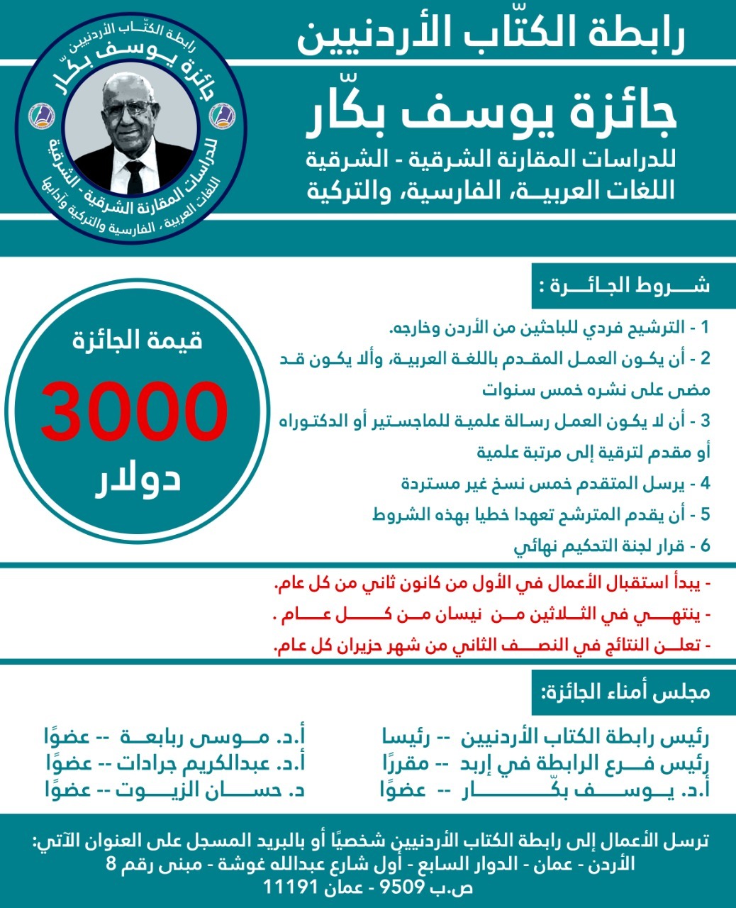 أعلنت رابطة الكتاب الأردنيين عن إطلاق جائزة يوسف بكّار للدراسات المقارنة الشرقية - الشرقية للغات العربية، الفارسية والتركية، وهي الجائزة الأولى من نوعها في هذا المجال، وتأتي بالتشاركية مع الناقد الدكتور بكّار الذي تكفّل بقيمة الجائزة.