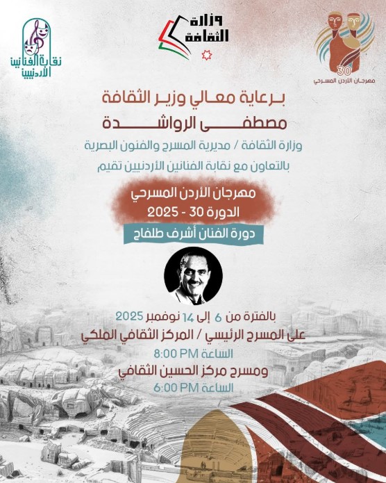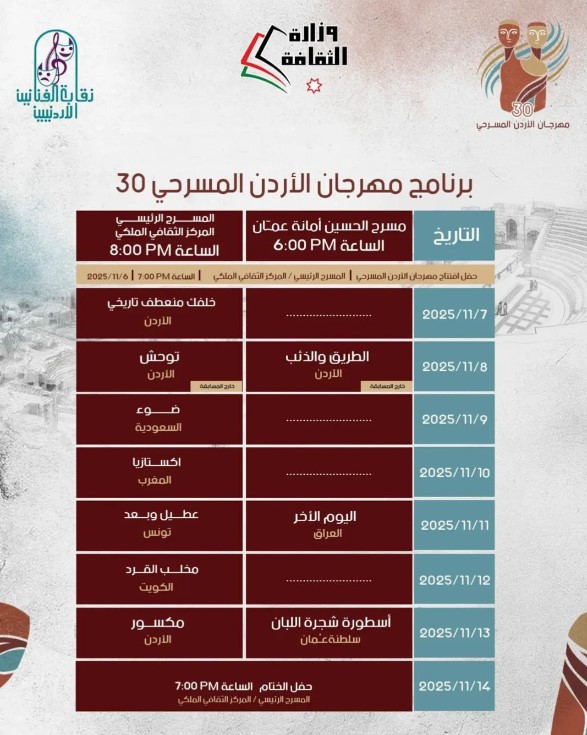 برعاية وزير الثقافة، مصطفى الرواشدة، تنطلق عروض مهرجان الأردن المسرحي، بدورته الثلاثين، في فضاءات المركز الثقافي الملكي، مساء يوم الخميس المقبل 6/11/2025، متواصلة حتى مساء يوم الرابع عشر من الشهر الحالي.