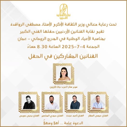 برعاية وزير الثقافة مصطفى الرواشدة، تقيم نقابة الفنانين الأردنيين في الثامنة والنصف من مساء الجمعة 4/7/2025، حفلها الفني الكبير احتفاءً بالأعياد الوطنية، على المدرج الروماني في العاصمة عمّان.