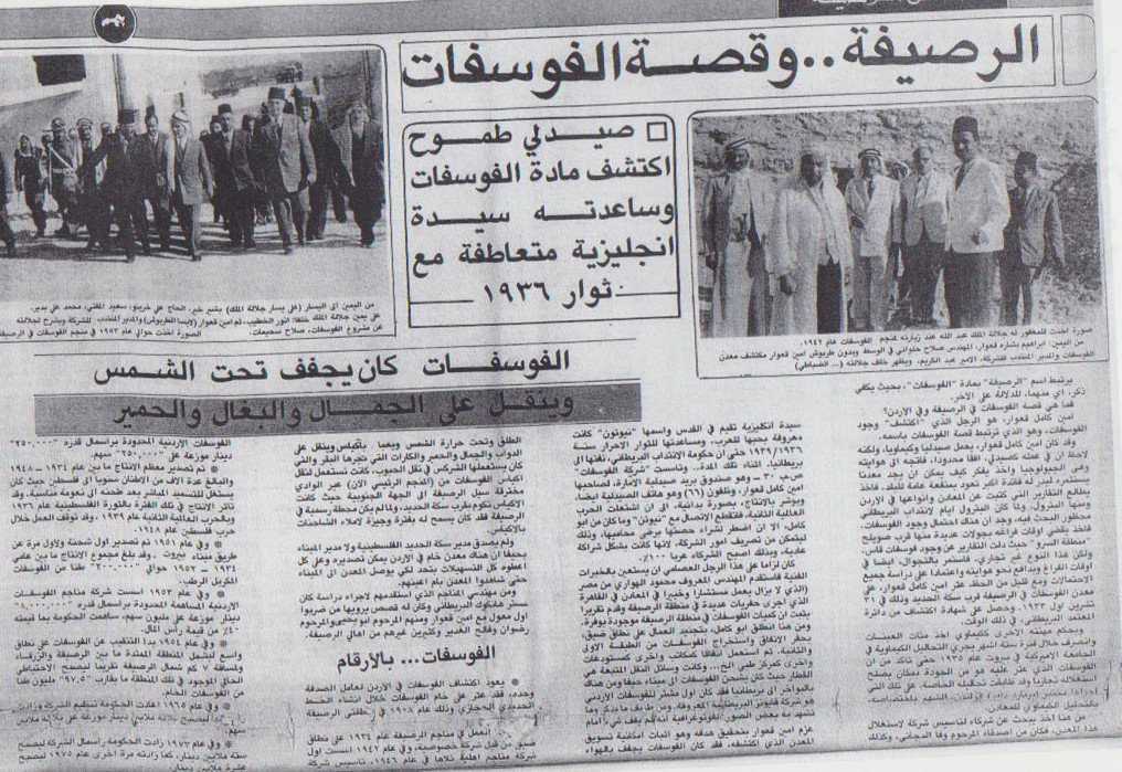 كما نشرت صحيفة الرأي بتاريخ 12/5/1981 تقريرا حول اكتشاف الفوسفات الذي أدى بدوره إلى اكتشاف عظام الطائر العملاق وتم إرفاق صور الزيارات الملكيه للمناجم في الرصيفة وأُرفق بأقوال وتصريحات للمسؤولين في حينه.