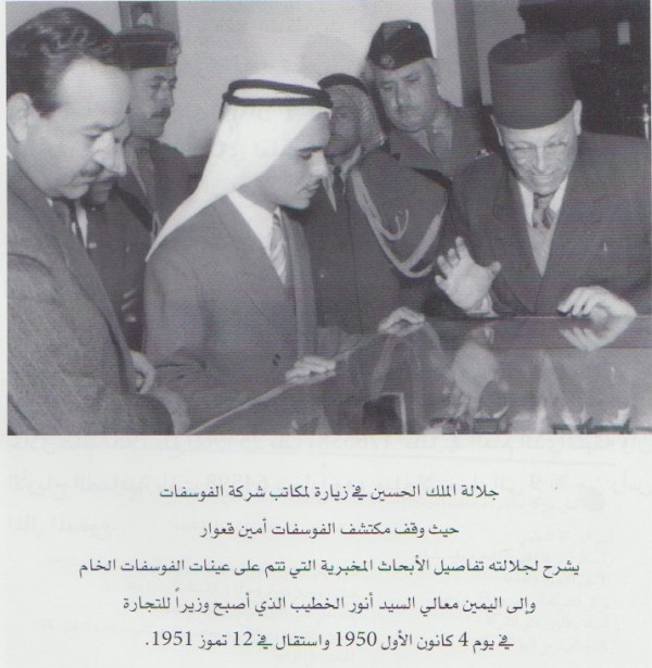 جلالة الملك الحسين بن طلال/ رحمه الله في زيارة لمكاتب الفوسفات حيث يستمع إلى شرح من السيد أمين قعوار