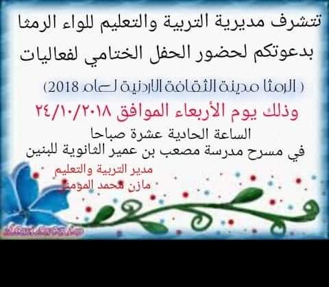 تقيم مديرية التربية والتعليم للواء الرمثا الحفل الختامي لفعاليات "الرمثا مدينة الثقافة الأردنية لعام 2018" وذلك يوم الأربعاء 24/10/2018 الساعة الحادية عشرة صباحاً على مسرح مدرسة مصعب بن عمير الثانوية للبنين.