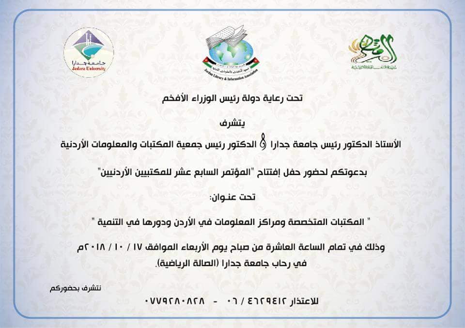 برعاية رئيس الوزراء د. عمر الرزاز تنطلق في العاشرة من صباح يوم الأربعاء 17/10/2018، فعاليات المؤتمر السابع عشر للمكتبيين الأردنيين "المكتبات المتخصصة ومراكز المعلومات في الأردن ودورها في التنمية" في جامعة جدارا؛ وذلك ضمن فعاليات لواء الرمثا عن إقليم الشمال (مدينة للثقافة الأردنية لعام 2018).