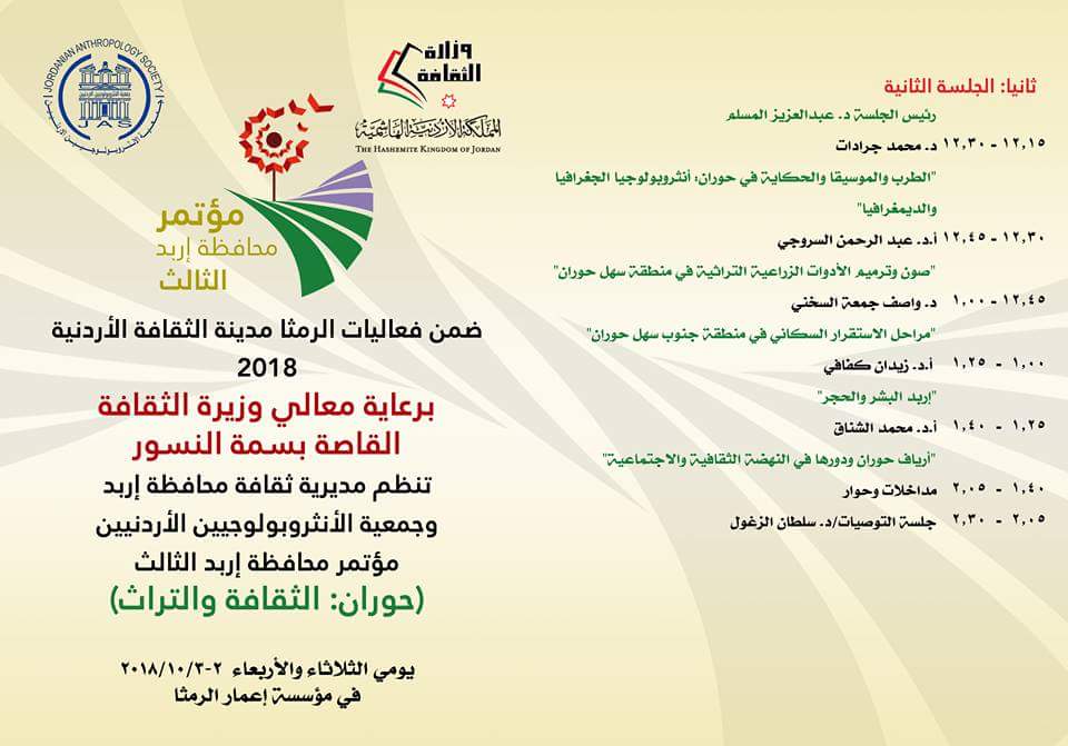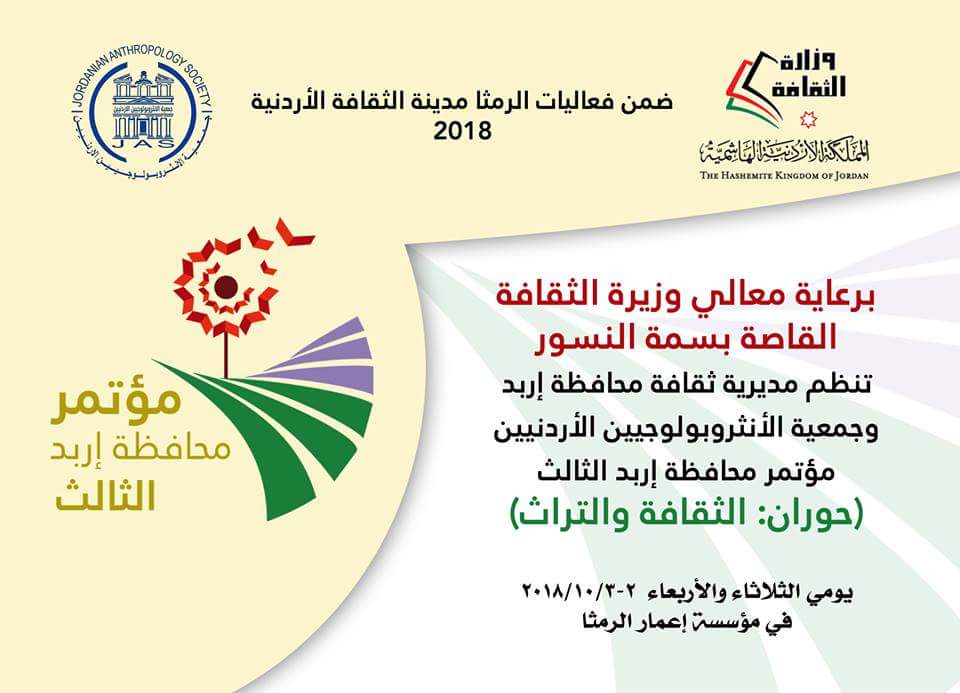 برعاية وزيرة الثقافة بسمة النسور تنظم مديرية ثقافة محافظة إربد بالتعاون مع جمعية الأنثروبولوجيين الأردنيين " مؤتمر محافظة إربد الثالث – حوران الثقافة والتراث" ضمن فعاليات لواء الرمثا عن إقليم الشمال مدينة للثقافة الأردنية لعام 2018.