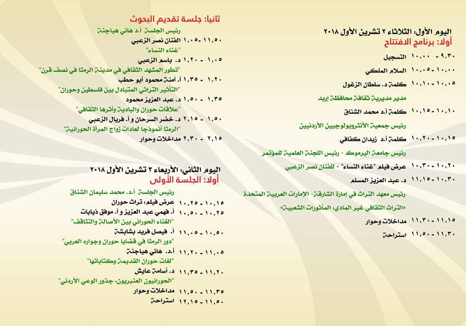 فيما تتضمن الجلسة الثانية التي يترأسها الدكتور عبدالعزيز المسلم، الحديث عن "الطرب والموسيقا والحكاية في حوران: أنثروبولوجيا الجغرافيا والديموغرافيا" يقدمها الدكتور محمد جرادات، و"صون وترميم الأدوات الزراعية التراثية في منطقة سهل حوران" يقدمها الدكتور عبدالرحمن السروجي، و"مراحل الاستقرار السكاني في منطقة جنوب سهل حوران" يقدمها الدكتور واصف السخني، و"إربد البشر والحجر" يقدمها الدكتور زيدان كفافي، و"أرياف حوران ودورها في النهضة الثقافية والاجتماعية" يقدمها الدكتور محمد الشناق، وتختتم فعاليات المؤتمر بجلسة التوصيات يقدمها الدكتور سلطان الزغول مدير ثقافة إربد.