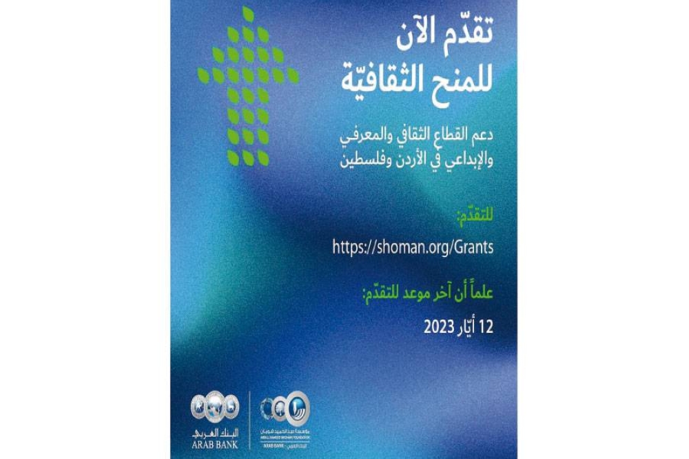 أعلنت مؤسسة عبد الحميد شومان، فتح باب التقدم لطلبات المنح الثقافية لعام 2023 في كل من الأردن وفلسطين ضمن نطاق الأدب والفنون، والفكر القيادي، مشيرة إلى أن آخر موعد للتقدم هو 12 أيار المقبل.