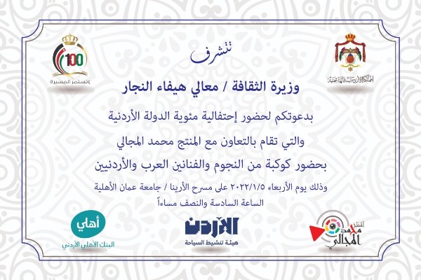 تقيم وزارة الثقافة في السادسة والنصف من مساء الأربعاء 5/1/2022، على مسرح الأرينا بجامعة عمان الأهلية، بالتعاون مع المنتج الأردني محمد المجالي، أوبريتا غنائيا بعنوان: «شعب واحد... قلب واحد»، بحضور عدد من الفنانين الأردنيين والعرب.