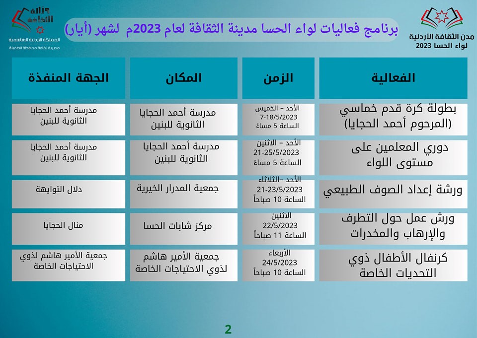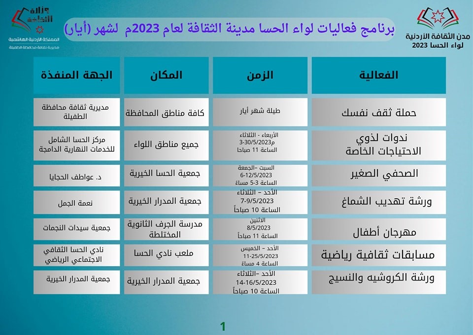 أطلقت مديرية ثقافة محافظة الطفيلة برنامج فعاليات لواء الحسا/ مدينة الثقافة الأردنية لعام 2023 لشهر أيار، حيث ضمت الفعاليات التي تنظمها مؤسسات وجمعيات وأفراد من المجتمع المحلي في لواء الحسا، برامج تدريبية ومسابقات ثقافية ومهرجانات للأطفال وكما ضم البرنامج ندوات متخصصة لذوي الإعاقة، وسيكون على مدار الشهر حملة ثقف نفسك تنفذها المديرية.