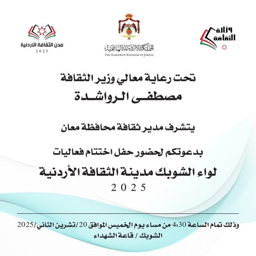 برعاية وزير الثقافة مصطفى الرواشدة تختتم على التوالي؛ فعاليات ألوية الثقافة لعام 2025 بعد عام حافل بالمشاريع الثقافية التي استهدفت جميع مكونات المجتمع المحلي في المملكة