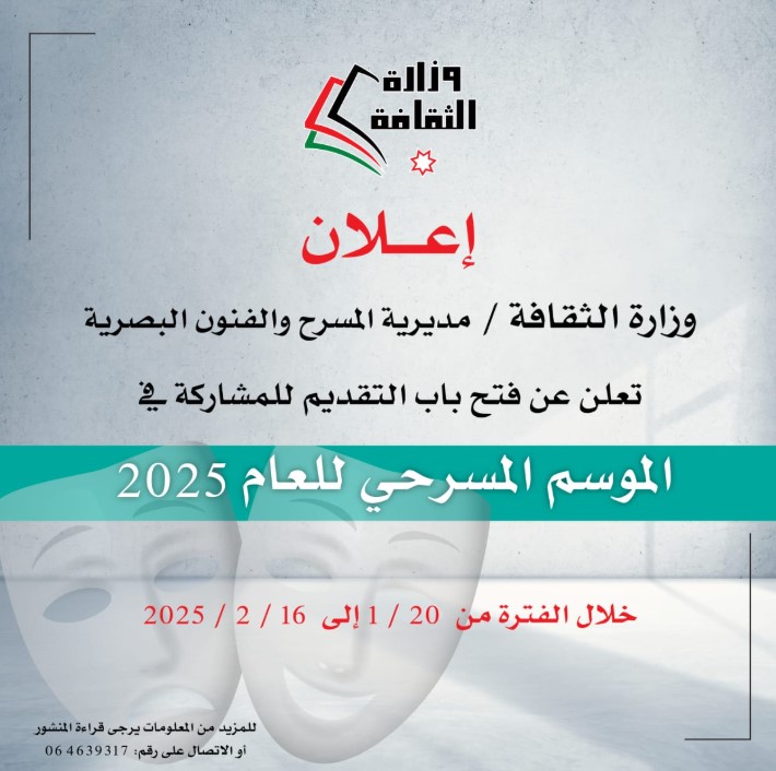 تعلن وزارة الثقافة/ مديرية المسرح والفنون البصرية عن فتح باب التقديم للمشاركة في الموسم المسرحي 2025 خلال الفترة من 20/1 – 16/2/2025، على الراغبين بالمشاركة تعبئة نموذج المشاركة وإرساله عبر البريد الالكتروني theater@culture.gov.jo حيث سيتم تقييم المشاريع على مرحلتين وضمن الشروط الآتية: