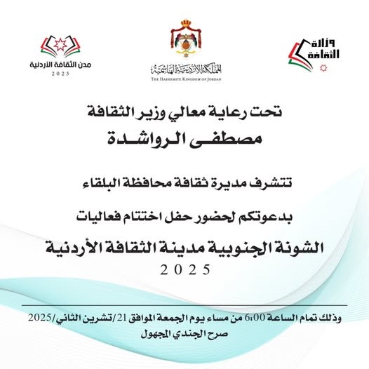 بينما تقام فعاليات ختام لواء الشونة الجنوبية/ مدينة الثقافة في السادسة من مساء الجمعة 21/11/2025 في صرح الجندي المجهول.