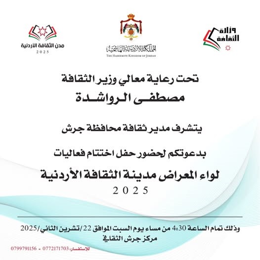 وأخيرا تختتم في جرش فعاليات لواء المعراض/ مدينة الثقافة في الرابعة والنصف من مساء السبت 22/11/2025 في مركز جرش الثقافي.